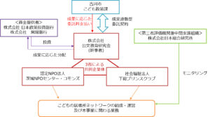 2010年にイギリスで開発された官民連携の社会的投資モデルのこと。社会課題を解決するサービスに、投資家が資金を提供してプログラムを実施し、削減された財政支出などの事業成果に応じて、自治体等が投資家に成果報酬を支払う。本事業ではプロセス指標とアウトカム指標の達成度合いに応じて、古河市から事業者に成果報酬が支払われる。